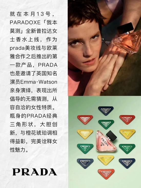 最近推出了新款 Paradoxe “我本莫测” 女士香水的 Prada,其美妆线 Prada Beauty便是由欧莱雅集团进行运营