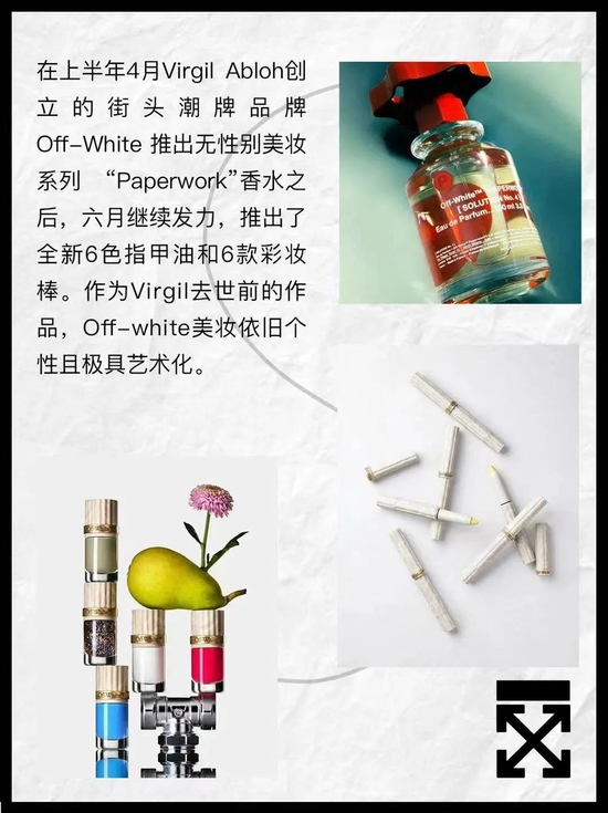 而在它们之前,很多街头潮流品牌已经抢先行动。MLB悄悄在天猫开出了自己的旗舰店,国内的首轮主推美妆产品涵盖了三款淡香水和两款气垫;盛极一时的Off-White也有了自己的首个无性别美妆系列 “Paperwork”。伴随着越来越多的时装品牌入局,美妆业务似乎已经成为了它们的必争之地。