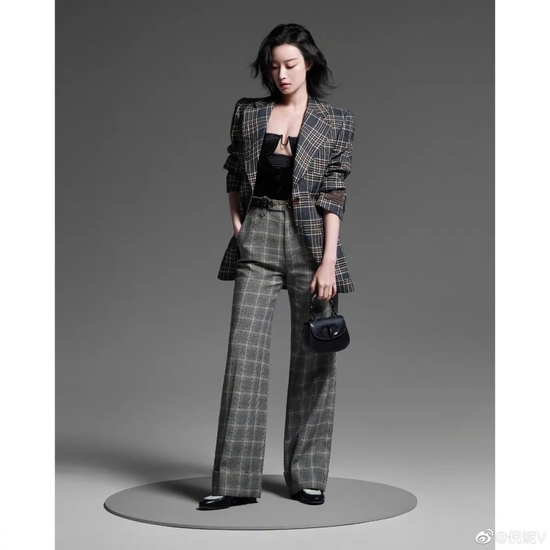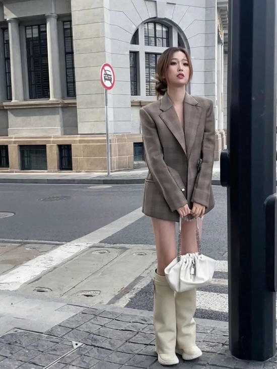 虞书欣也是隐藏的‘格子控’,格纹西装外套看似漫不经心,来个“下半身失踪”和直筒膝下靴的搭配,时髦程度直逼时尚博主,腿部线条给硬朗的搭配增加一些女性魅力,很绝的欣欣子。