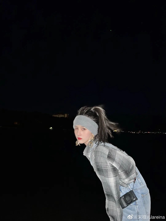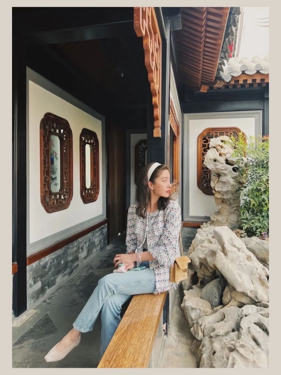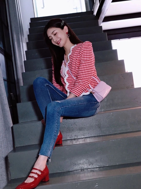 轻巧的颜色和格纹放在一起,是微风拂面的柔和舒服,格纹+牛仔裤这个公式学会了,有种轻量感的时髦。发箍配饰是关键,细节的处理让杨采钰这身穿搭与众不同。