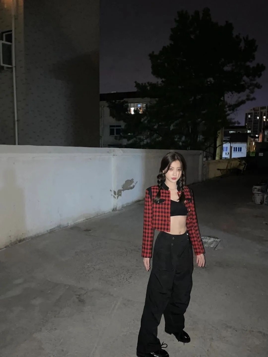 最近这件短款外套也是穿得让人“嘶哈”,红黑格纹很有学院派风格。内搭一件top上衣秀出好身材,下装则是用工装裤来平衡性感,“辣”到不行。