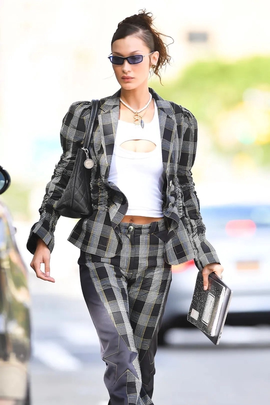 套装出街是容错率很高的穿法,不过整齐的格纹总是觉得有那么些视觉乏味,Bella用一件设计感上衣内搭打破这种秩序,很值得借鉴!