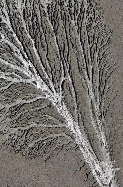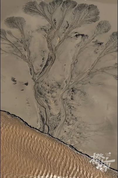 广袤的滩涂上,万千条潮汐冲刷出的沟沟渠渠,形成了一棵“大树”的图案。