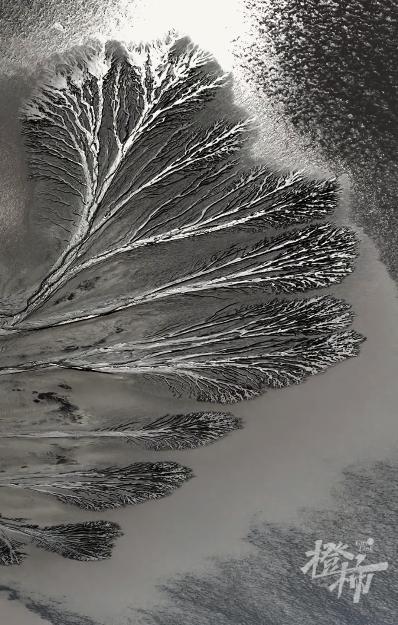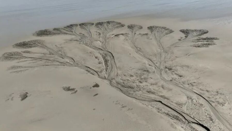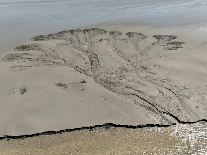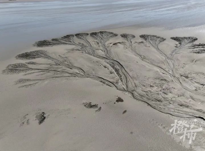 这是一种在海陆交汇处才能发现的景观,它“生长”在潮间带上,因潮汐往来,潮水在海滩上冲刷出了一道道潮沟,它们像是河流、羽毛,更像是一棵棵“潮汐树”。