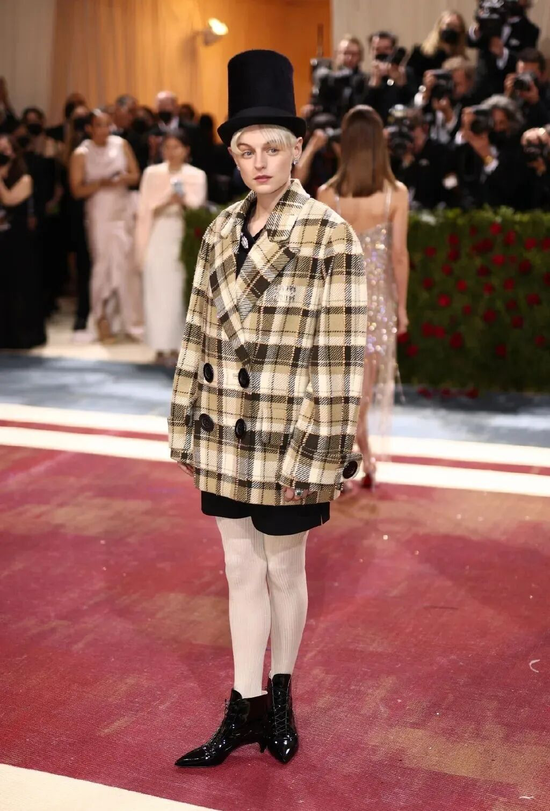 Miu Miu女孩Emma Corrin复刻了镀金时代纽约社交达人Evander Berry Wall的经典造型,女扮男装,玩转中性风,还有点俏皮。