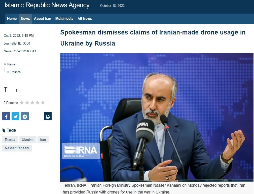 伊朗外交部发言人驳回有关伊朗无人机被用于乌克兰危机中的说法。图片来源:伊朗伊斯兰共和国通讯社报道截图