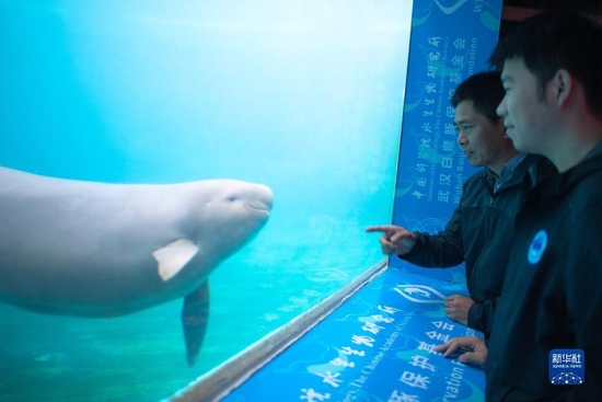 10月18日,在湖北武汉的中科院水生所白鱀豚馆,长期从事长江江豚保护研究工作的郝玉江副研究员(左)在向学生讲解江豚行为习惯。新华社发