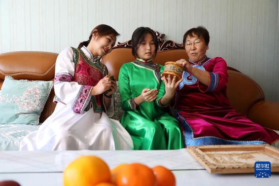 10月17日,内蒙古莫力达瓦达斡尔族自治旗布西社区居民杜文娟(左)和家人在一起。新华社记者 邹俭朴 摄