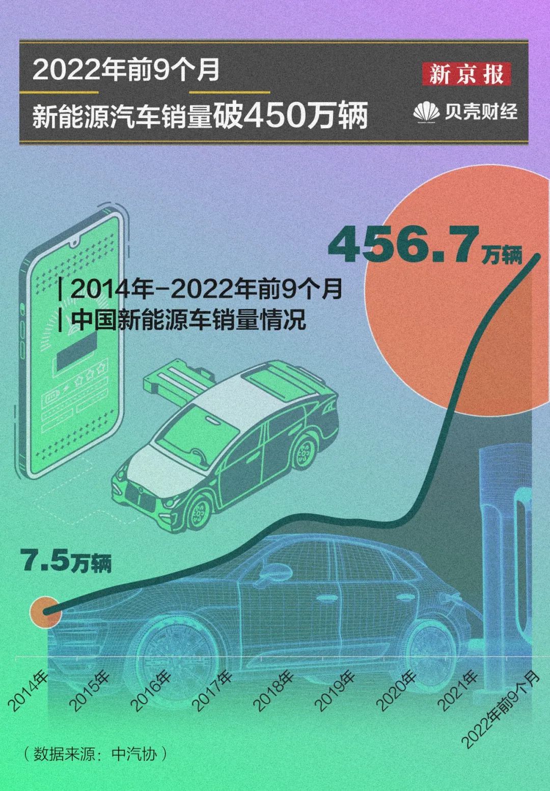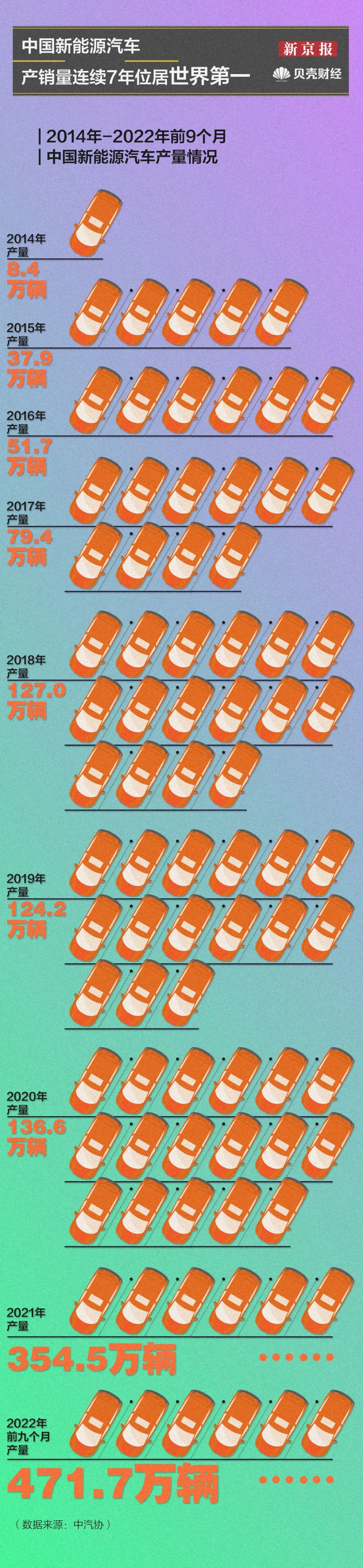 近十年,我国新能源汽车市场逐步扩大,新能源汽车产销量连续7年位居世界第一。2014年,我国新能源汽车产量仅为8.4万辆,销量为7.5万辆;2021年,其产销量同步翻倍增长,均超过250万辆。2022年,新能源汽车产销量再创新高,前九个月产量达471.7万辆,同比增长1.2倍,销量已达456.7万辆。此外,截至2022年9月,新能源汽车市场占有率已增至23.5%。