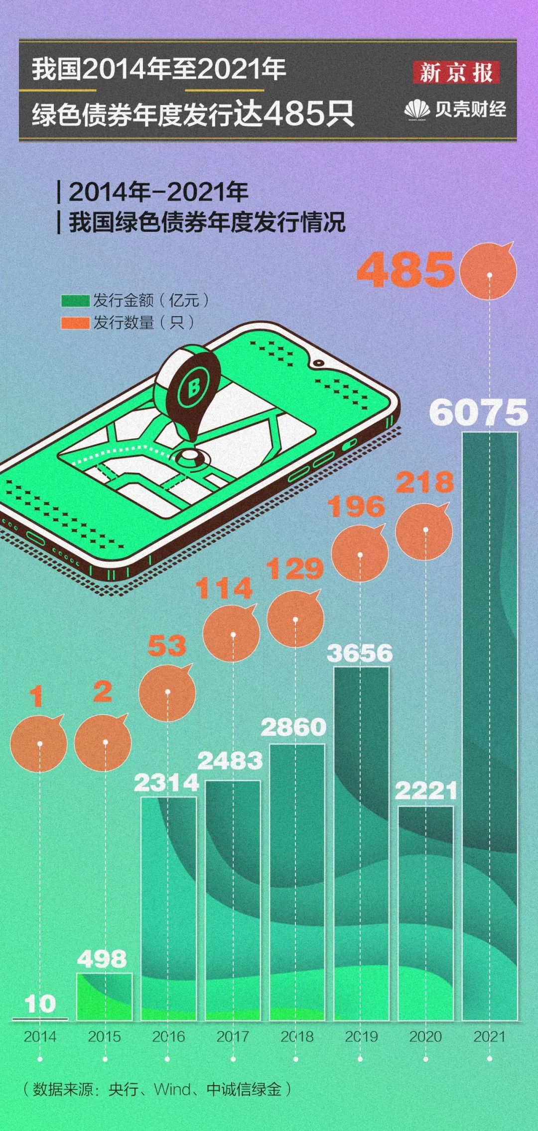 虽然我国绿色债券起步略晚,但发展势头强劲。2014年,我国仅发行1只绿色债券,发行金额共计10亿元,到2021年,我国发行绿色债券数量达485只,发行金额达6075亿元。据央行研究院分析,截至2022年6月末,我国绿色债券存量规模1.2万亿元,位居全球第二位。