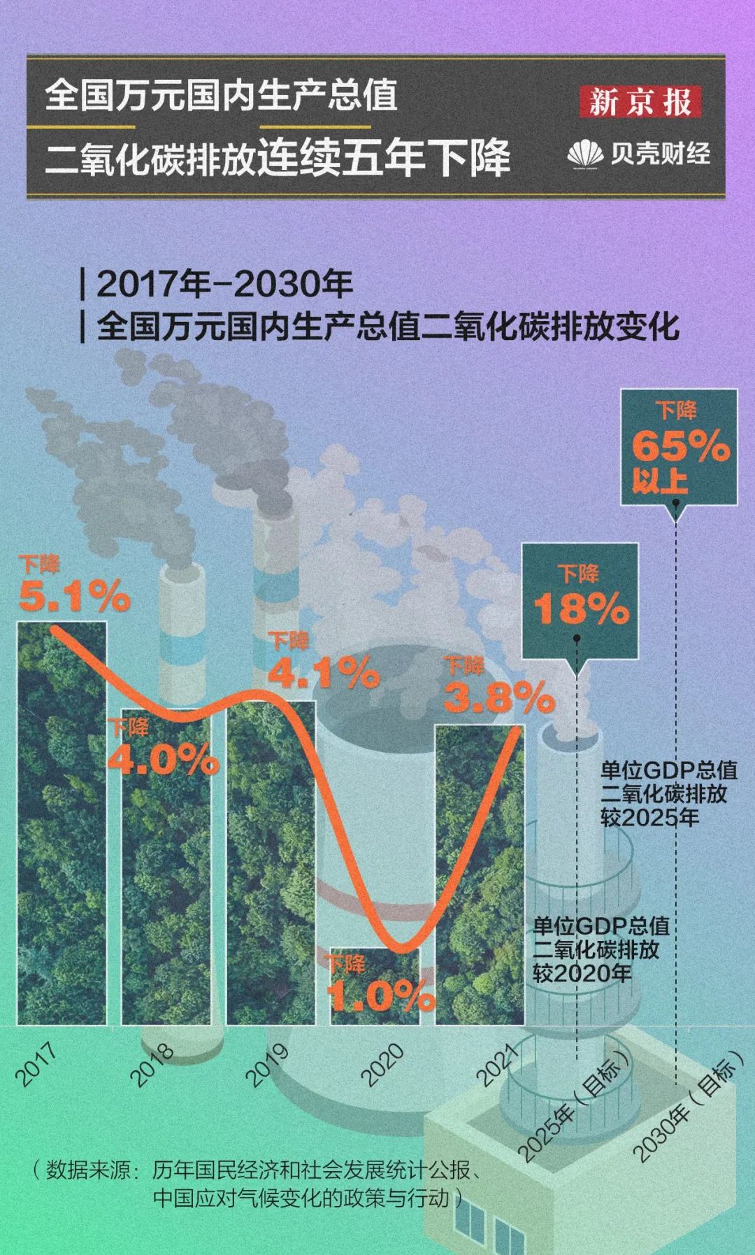 数据显示,2017年至2021年,我国万元国内生产总值二氧化碳排放连续下降,其中2019年底提前超额完成2020年气候行动目标。在2020年,我国提出新目标,二氧化碳排放力争在2030年前达到峰值,并在2030年实现单位GDP二氧化碳排放较2005年下降65%以上。