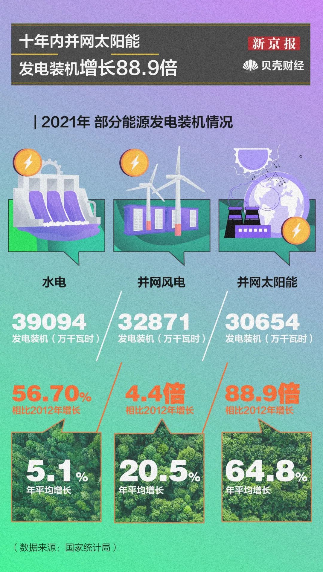 同2012年相比,2021年我国水电、风电、太阳能发电装机均超过3亿千瓦,并网太阳能发电增长88.9倍。2021年,并网太阳能发电30654万千瓦时,年均增长64.8%;并网风电32871万千瓦时,相比2012年增长4.4倍。