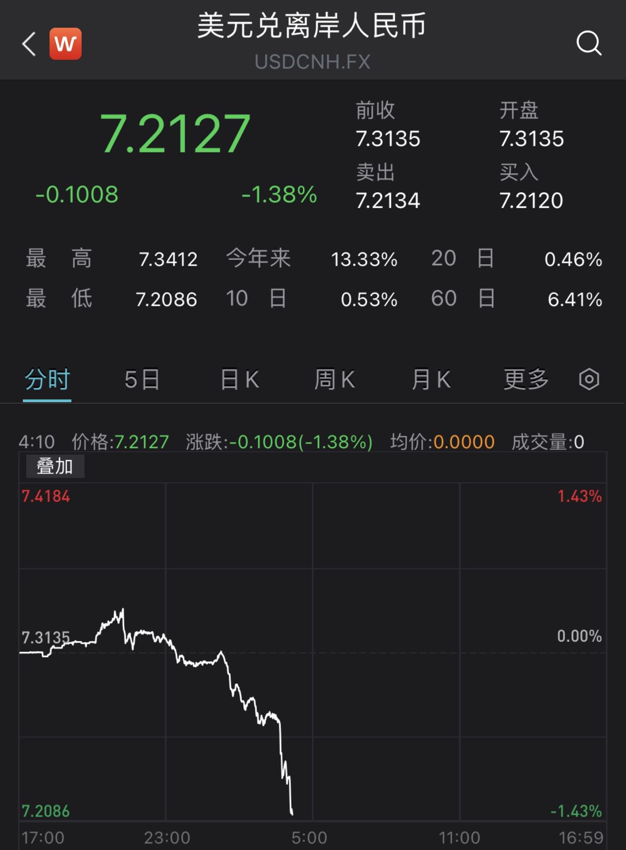 10月26日,更多反映国际投资者预期的离岸人民币对美元汇率从盘中最低的7.3412升值超过千点,截至发稿,最高升值至7.2086。