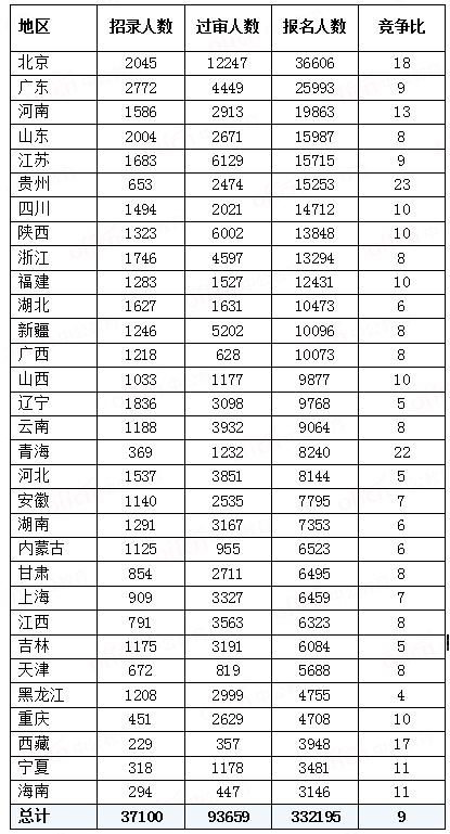 进入报名第二天,各地报名正在持续进行当中,截至今日16时,首都北京的报名人数占据绝对性优势,目前已经有36606人提交报名申请,比25日同期翻了一番,也是唯一一个报名人数超过三万的地区,比位列第二的广东省多出一万多人,吸引力无与伦比。但竞争最激烈的地区是贵州省,目前竞争比例已经达到23:1,超出平均竞争比的2.5倍。