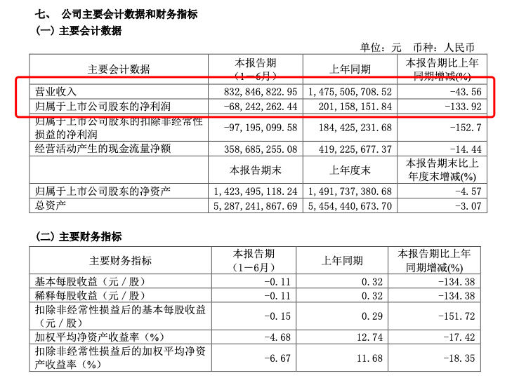 据公司8月发布半年报显示,2022年上半年,公司实现主营收入8.33亿元,同比下降43.56%;归属于母公司的净利润为-6824.23万元,同比下降133.92%。