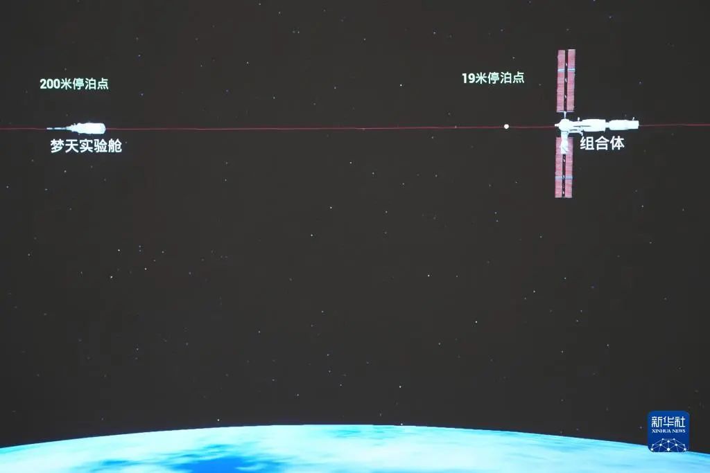 ▲11月1日在北京航天飞行控制中心拍摄的空间站梦天实验舱与空间站组合体在轨完成交会对接。这是梦天实验舱从200米停泊点向19米停泊点靠近的模拟图像。新华社发(孙丰晓 摄)