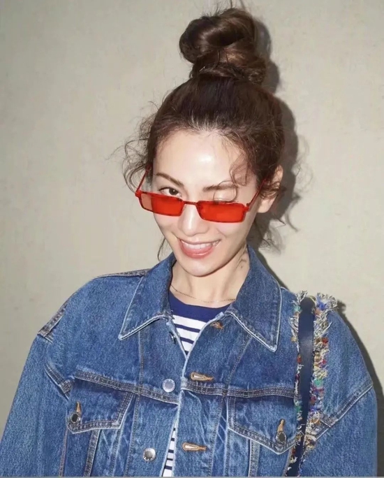 丸子头和牛仔外套的清爽搭配,加上红色复古方框墨镜的点亮,也很出片。