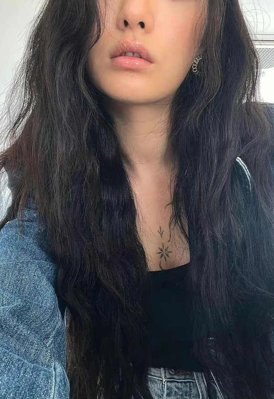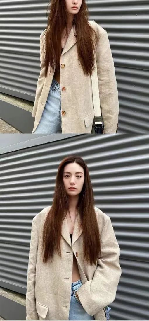 长直发也很能突出平直的五官线条和骨骼走向表现出的清冷感和疏离感。简单搭配西服和牛仔裤就很出挑。