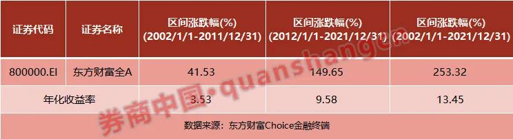 A股仅有30多年的历史,股市收益率也超越债券等固收产品的收益率。统计数据显示,在2002~2011年的10年间,东方财富全A指数上涨41.52%,年化收益率为3.53%,由于在此阶段上市公司数量较少,整体估值较贵,股市收益率亦乏善可陈;在2012~2021年10年间,东方财富全A涨幅149.65%,年化收益率为9.58%。如果将时间跨度扩展到2002年~2021年的两个10年,则东方财富全A资产组合的年化收益率为13.45%。