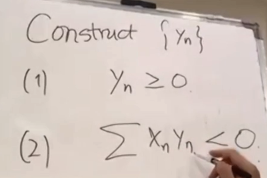 我们找一组新的实数序列{yn},它要满足两个条件。第一:yn≥0,第二个:∑xnyn<0。只要能找到这样一组yn,这问题就解决了。