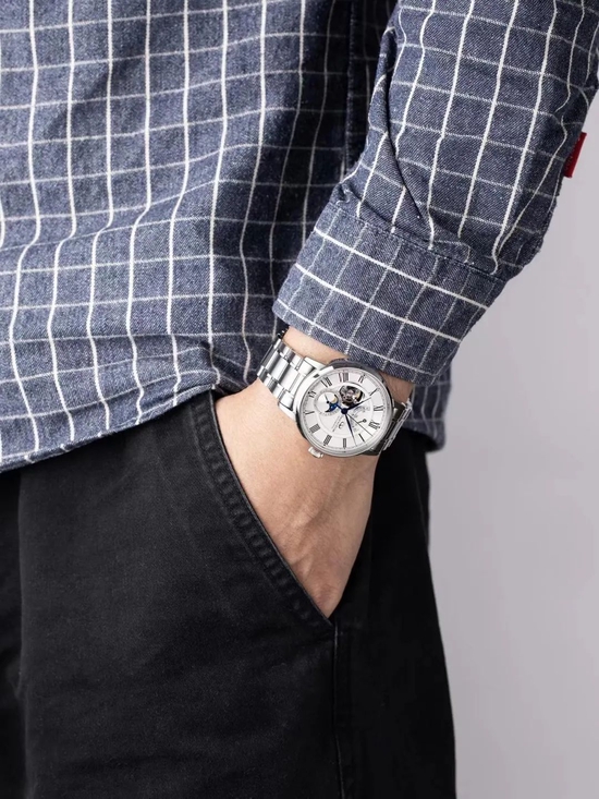 全日历月相设计,让你不会错过每一个阴晴圆缺的时刻,与月相盘相交的,则是东方星独有的偏芯透窗,让你在观赏月相的同时,还能拥有直观感受机芯律动的视觉体验,这就是东方美学与机械运动的巧妙结合。