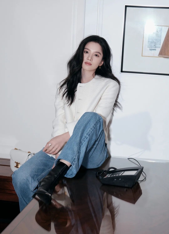 时髦感十足的夹克牛仔裤,搭配简约的高跟短靴,除了清秀,还有一种知性的美感。