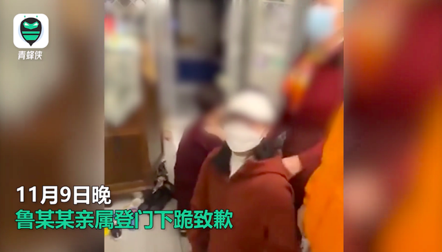 11月9日晚,疑似打人男子的家属登门道歉。视频画面显示,打人男子的两位亲属跪倒在地,不断哭求对方原谅。男童家属多次搀扶二人,对方仍然跪倒在地未起身。