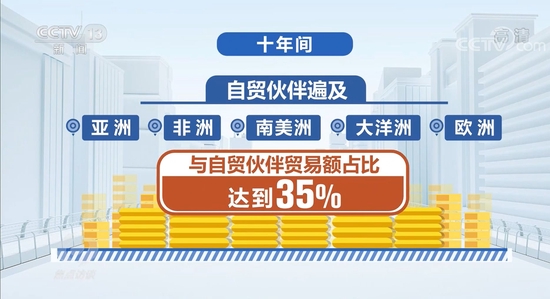 中国致力于推动建设开放型世界经济,十年间,已与26个国家和地区签署19个自由贸易协定,自贸伙伴遍及亚洲、非洲、南美洲、大洋洲和欧洲,与自贸伙伴贸易额占比达到了35%。同时,共建“一带一路”越走越实,截至2022年7月底,全球已有149个国家和32个国际组织与中国签署了200多份关于“一带一路”的合作文件,形成3000多个合作项目,投资规模近1万亿美元。
